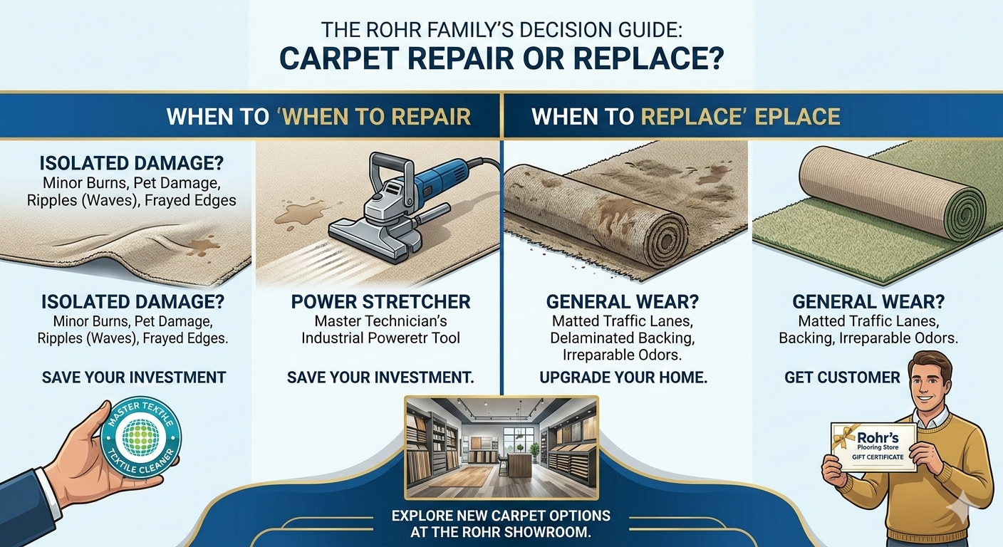 We believe in giving you a straight answer, not a sales pitch. Use this guide to help you decide if your carpet needs a Master Technician’s repair or a fresh installation from our showroom.